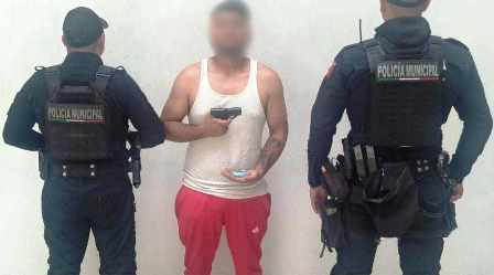 Zamora, Mich.- Este sábado durante recorridos de vigilancia agentes de la Dirección de Seguridad Pública Municipal y Guardia Nacional detuvieron a un hombre en posesión de una réplica de arma de fuego y varios envoltorios con droga sintética conocida como cristal.