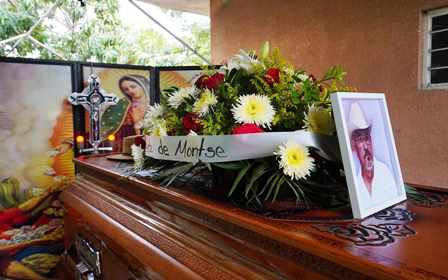 El féretro al centro, con su fiel compañero, su sombrero encima, al frente la fotografía del hombre, que, con voluntad, valor y sangre por años peleó buscando mejorar las condiciones de su comunidad, y en la parte posterior la imagen de la Virgen de Guadalupe, como una madre cuidando a su hijo amado.