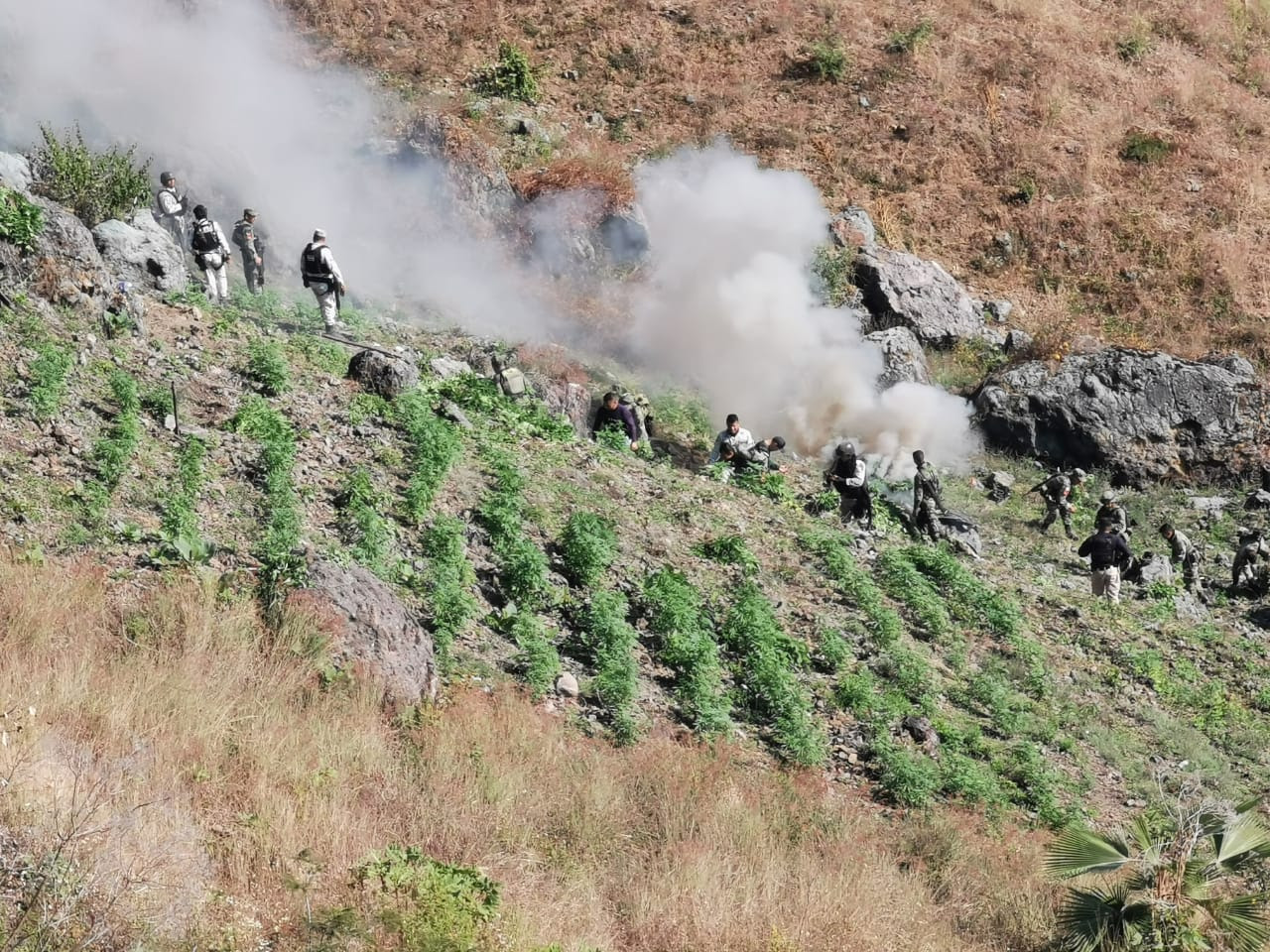 En estrecha coordinación con personal de la Secretaría de la Defensa Nacional (Sedena), Fiscalía General del Estado (FGE), y de la Guardia Nacional (GN), los efectivos de SP mantenían recorridos de vigilancia a la altura de la comunidad Sierra Chica, ubicada en esta demarcación; lugar y momento donde visualizaron un plantío con hierba verde y seca, al parecer marihuana.