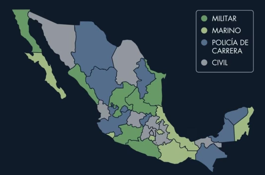 Al corte de abril del 2024 se observó que en 14 de las 32 entidades federativas los titulares de seguridad tienen una formación en la Marina, Ejército u otra institución de las Fuerzas Armadas de México.