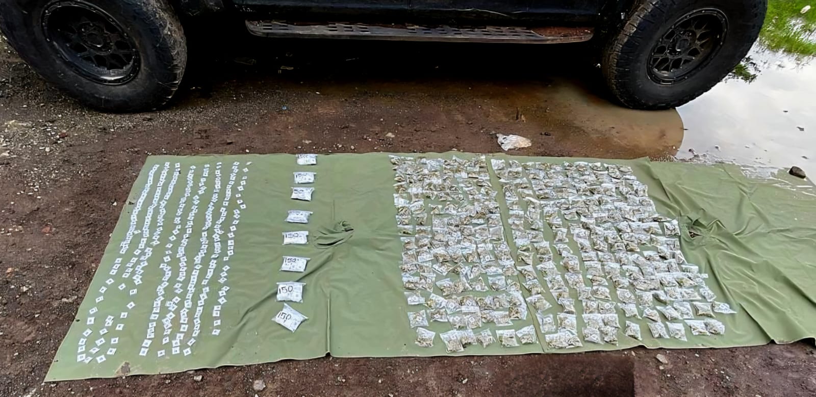 Los soldados y guardias nacionales establecieron un perímetro de seguridad y al revisar, en el interior de una Ford F-150 de color negro, sin placas, localizaron 1,500 dosis de metanfetamina y 250 envoltorios con mariguana.