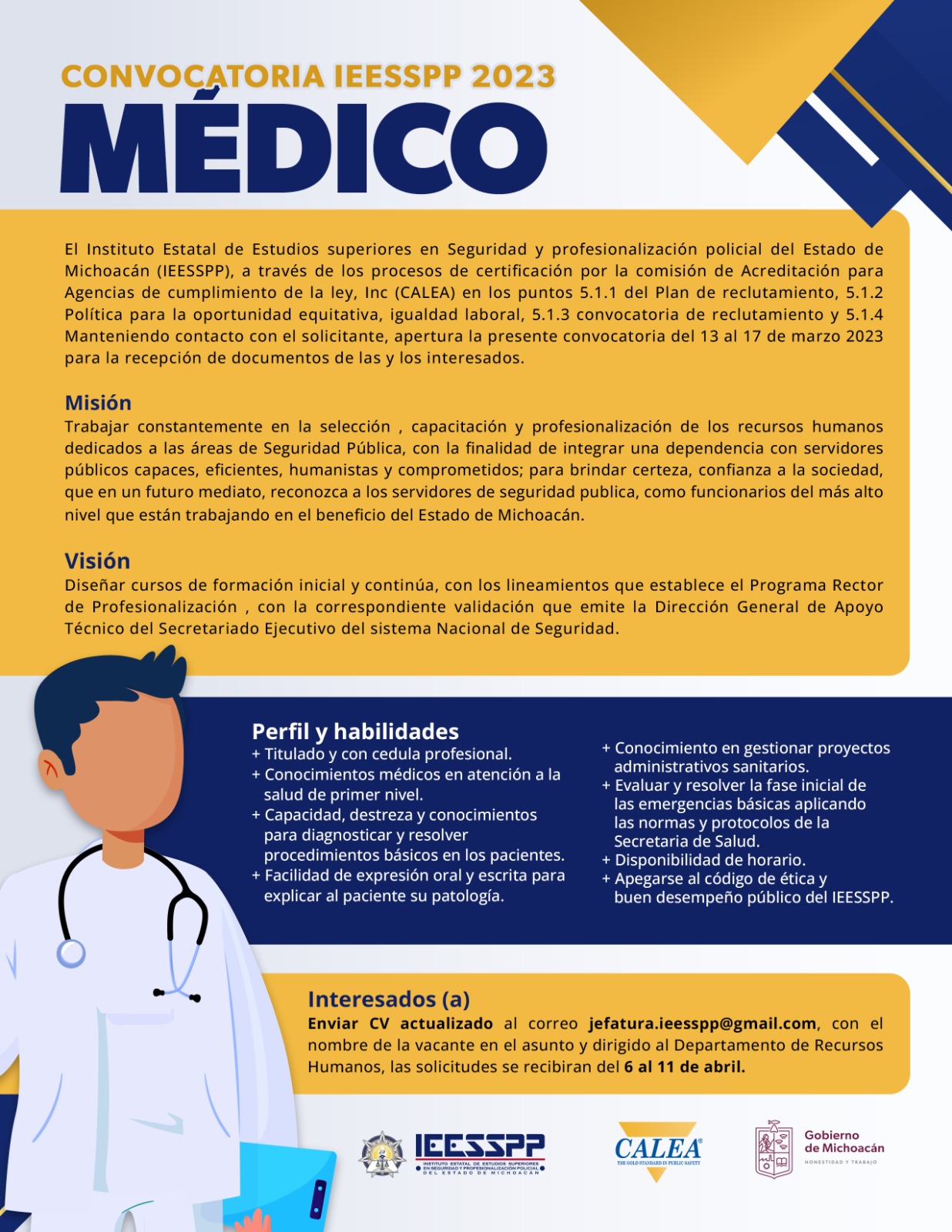 Morelia, Michoacán.- En seguimiento a los lineamientos de la Comisión de Acreditación para Agencias de Cumplimiento de la Ley, Inc (CALEA), se abrió la convocatoria para ocupar las vacantes de médicos, nutriólogos, cocineros, ayudantes de cocina y limpieza en el Instituto Estatal de Estudios Superiores en Seguridad y Profesionalización Policial del Estado de Michoacán (IEESSPP).