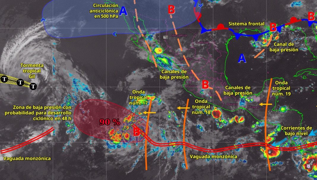 Para hoy, el monzón mexicano, ocasionará lluvias puntuales muy fuertes en Sinaloa y Durango; y puntuales fuertes en Nayarit, Sonora y Chihuahua; así como lluvias con intervalos de chubascos en Baja California Sur; todas las lluvias acompañadas con descargas eléctricas. Por su parte, el ingreso de aire húmedo del océano Pacífico en combinación con inestabilidad en altura sobre el occidente de México, propiciará lluvias puntuales muy fuertes en Jalisco y Colima; y puntuales fuertes en Guerrero y Michoacán, todas con descargas eléctricas, y con posible caída de granizo en zonas altas.