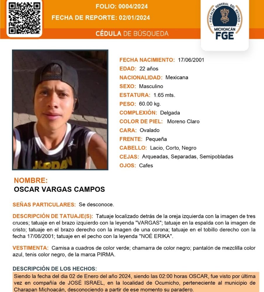 La Fiscalía General de Michoacán hace un llamado a la población para que, en caso de tener un dato que contribuya a la localización de José Israel Vargas Jerónimo y Oscar Vargas Campos, se comuniquen al 800 6142323. RED 113 MICHOACÁN/Redacción