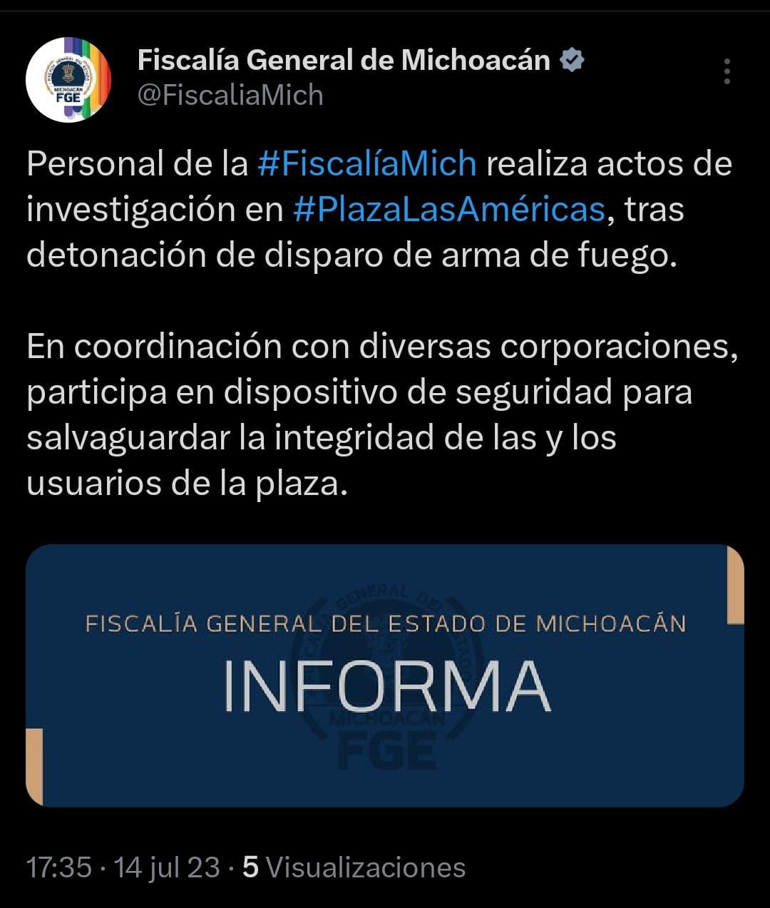 Morelia Michoacán.- La Fiscalía General del Estado de Michoacán (FGE) inició actos de investigación para esclarecer los hechos registrados esta tarde en el estacionamiento de la plaza comercial Las Américas, en esta capital.