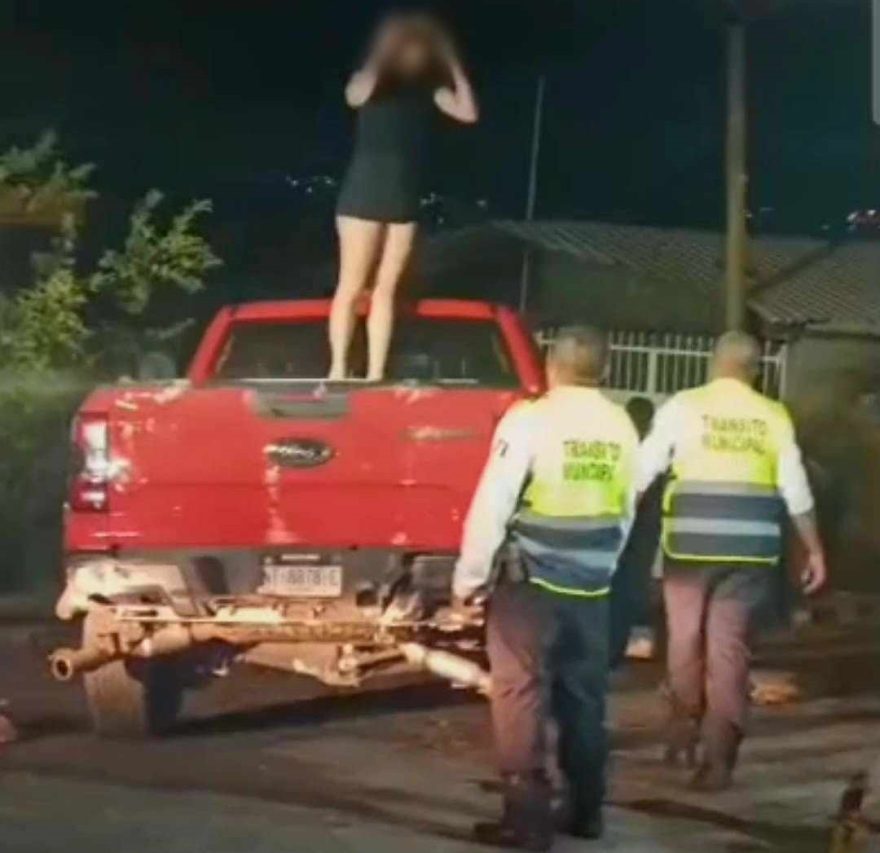 Tras el percance, la fémina subió al área de la caja de la camioneta para evitar ser detenida, donde estuvo bailando y gritando cosas por aparente estado de ebriedad