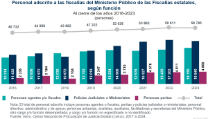 Al cierre de 2023, había 16 659 personas adscritas al Ministerio Público de la Federación y 58 785 a los Ministerios Públicos de las entidades federativas