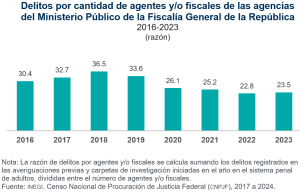 Entre 2016 y 2023, la carga de trabajo de la FGR —medida como la razón de delitos por cada agente y/o fiscal— disminuyó de 30.4 a 23.5, lo que representa una reducción de 6.9 puntos.