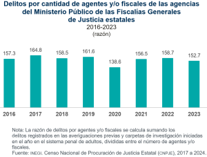 En 2023, por cada agente y/o fiscal del Ministerio Público federal se registraron 23.5 delitos para su investigación, mientras que en los Ministerios Públicos de las entidades federativas fueron 152.7 delitos a investigar por agente y/o fiscal.