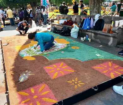 En el paseo que divide la plaza de Armas y la Plaza Juárez, ya hay personas armando y diseñando los también tradicionales tapetes de aserrín pintado, dando forma y creando estampas a través de los colores en polvo.