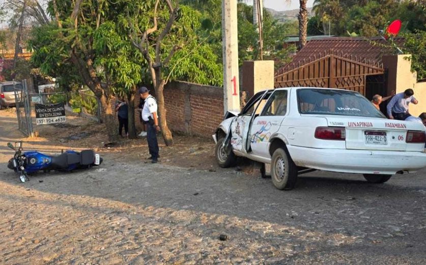 Elementos de Seguridad Vial se encargaron de los peritajes respectivos y aseguraron la motocicleta, una de la marca Bajaj tipo Dominar 400, de color azul con negro, con placa 83PSL7, así como un Taxi Nissan Tsuru, del Sitio Juchari Uinapikua Patamban, con matrícula PRH-422-D.
