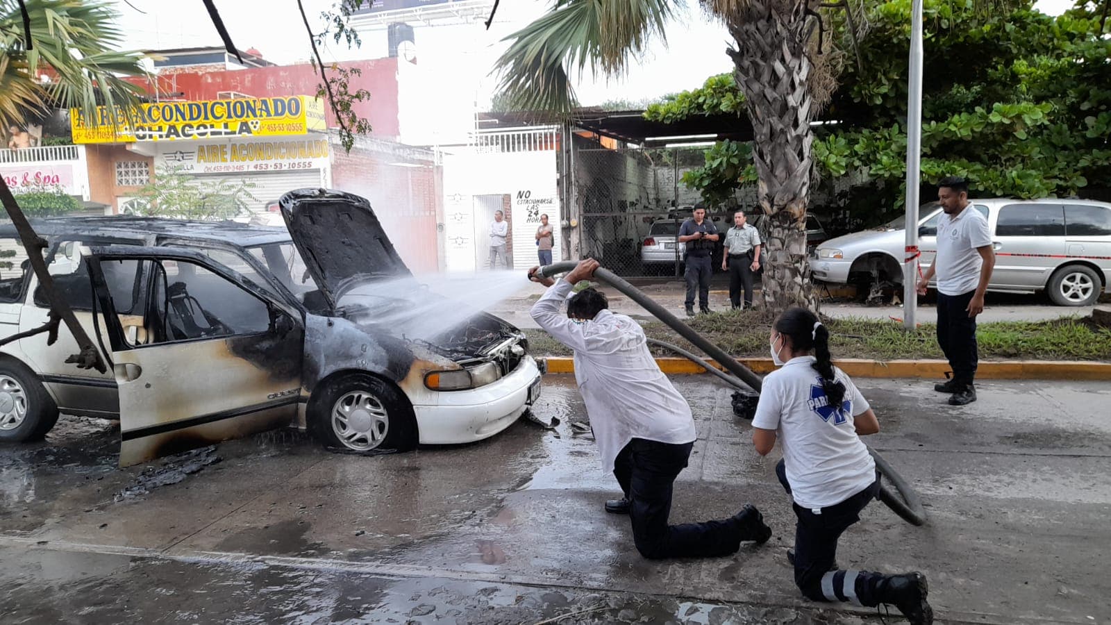 Apatzingán, Mich.- Elementos de Protección Civil municipal y bomberos de Apatzingán salvaron a una familia que estaba atrapada en el interior de un vehículo en llamas.