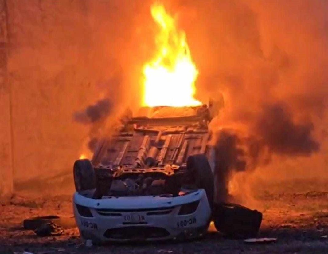 Fue así que un grupo de sujetos protestaron por unos minutos por fuera de las instalaciones policías, sin embargo, los ánimos se calentaron y un grupo de sujetos a patadas abrió el portón del corralón y al ingresar volcaron una patrulla para enseguida prenderle fuego, al tiempo que también retiraron auto resguardados por alguna infracción.