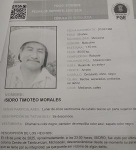 Respecto a Isidro Timoteo, éste fue visto por última vez la noche del pasado 18 de junio del año en curso en el centro de la cabecera municipal de Tzintzuntzan. Desde entonces se desconoce su paradero y se teme por su integridad física. Cualquier dato que ayude a localizarlo favor de reportarlo al número de emergencias 911 o a la Fiscalía General del Estado (FGE). RED 113 MICHOACÁN/Redacción