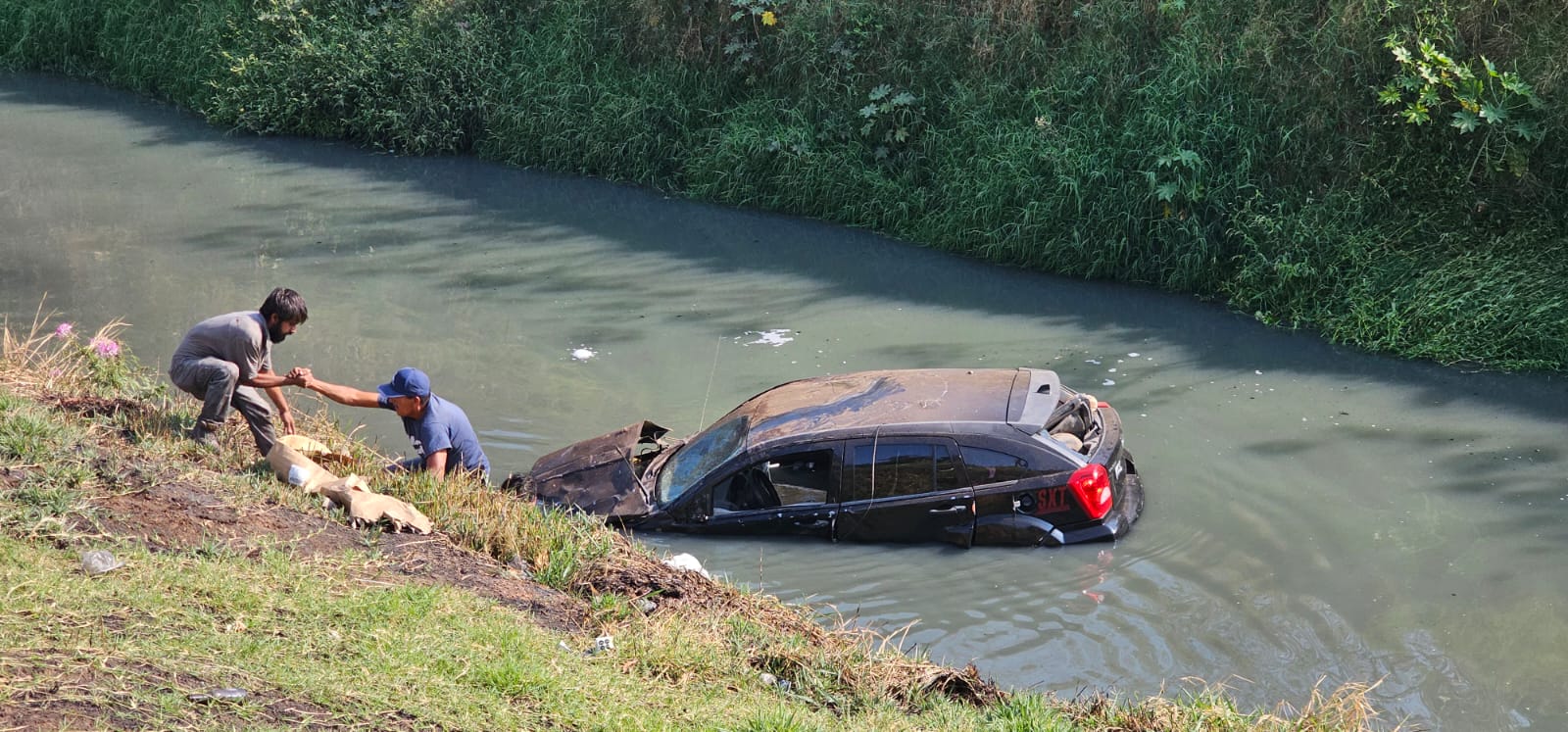 Zamora, Mich.- Presuntamente, por evitar chocar contra un camión de pasajeros que iba rebasando, dos jóvenes trabajadores de la construcción cayeron con su automóvil a un río de aguas negras en esta ciudad de Zamora, ambos por fortuna salieron ilesos.