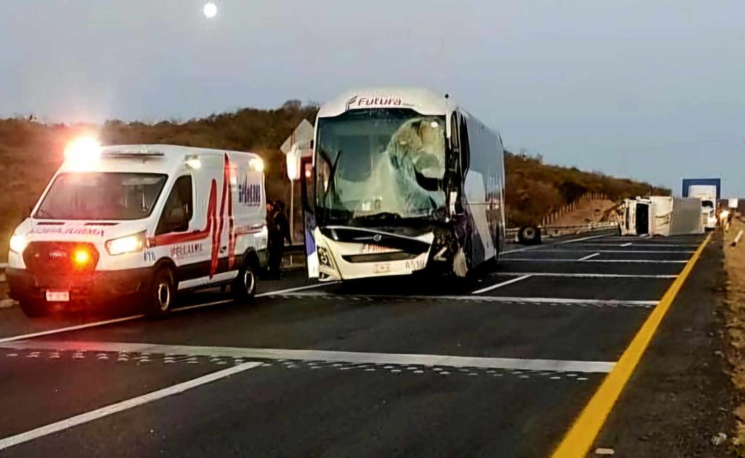 Panindícuaro, Mich.- Un autobús de pasajeros chocó contra un camión de carga que terminó volcado en la autopista México–Guadalajara, el territorio del municipio de Panindícuaro, sin que por fortuna hubiera víctimas que lamentar.