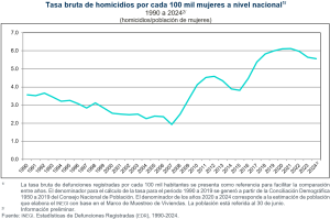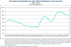 Durante 2024 se obtuvo, de manera preliminar, una tasa de 25.6 homicidios por cada 100 mil habitantes a nivel nacional. Esta resultó mayor a la registrada con información definitiva en 2023, que fue de 24.9.