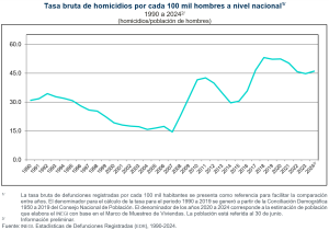 En el caso de los hombres, en 2024, la tasa fue de 46.0 homicidios por cada 100 mil hombres. Al comparar con el mismo periodo de 2023, se observó un incremento de 1.2 respecto a la información definitiva, ya que en ese año fue de 44.8.