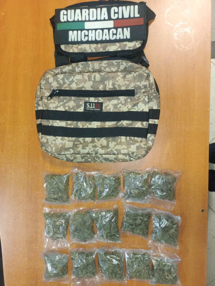 Fue en Uruapan, que al masculino le fueron localizados 15 envoltorios con hierba verde y seca, al parecer marihuana; mientras que en Ario, a la fémina le encontraron entre sus pertenencias, siete unidades con sustancia granulosa, con las características propias de la metanfetamina. Es por lo anterior que las dos personas junto con las drogas aseguradas fueron puestos a disposición de la autoridad encargada, a fin de determinar su situación jurídica con base en la Ley.