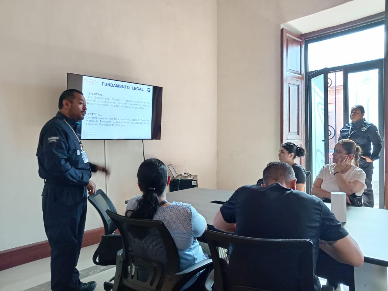 Morelia, Michoacán.- En aras de generar sinergia y colaborar de la mano con cada sector de la población, en pro de prevenir y disuadir delitos, los elementos de la Secretaría de Seguridad Pública (SSP) impartieron una capacitación para evitar la trata de personas, a integrantes del gremio empresarial, en Morelia.