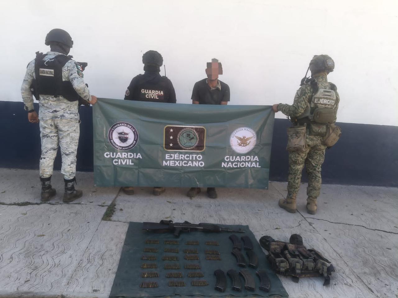 Tras recorrer un camino de terraceria en las inmediaciones de la localidad de Puerta Chica, municipio de Parácuaro, los agentes detuvieron al hombre, a quien le fue asegurado un fusil, además de ocho cargadores y 210 cartuchos calibre 7.62X39 milímetros.