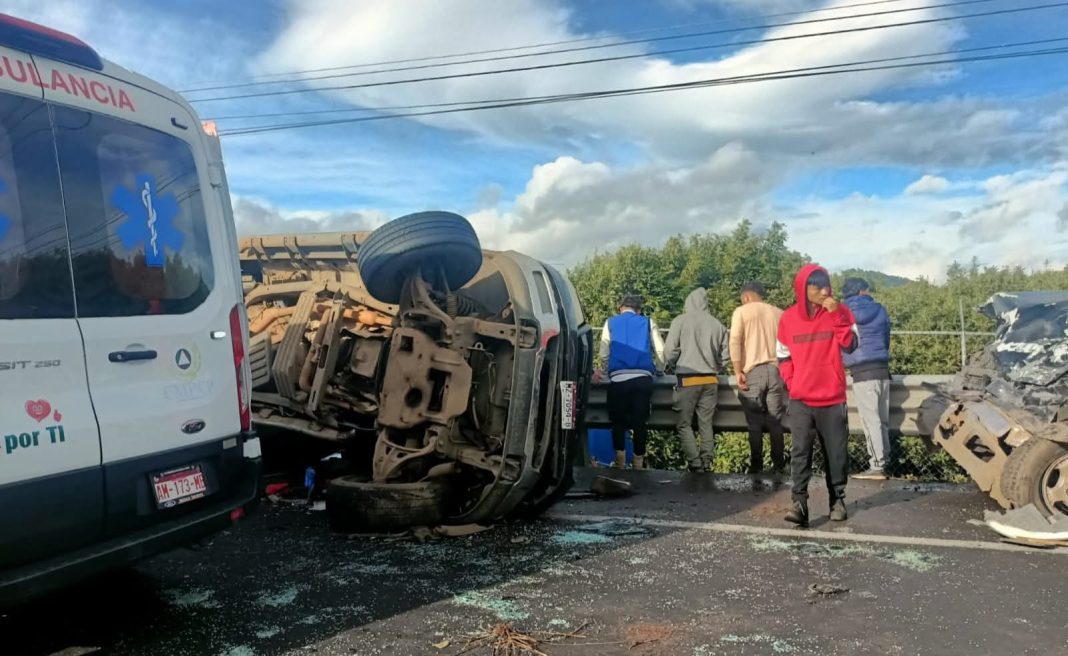 Peribán, Mich.- Un aparatoso accidente ocurrido la mañana de este sábado sobre la carretera Uruapan-Los Reyes dejó un saldo de siete personas heridas, entre ellas varios trabajadores agrícolas. El choque involucró a una camioneta que transportaba jornaleros y a un camión cargado con aguacates, el cual terminó volcado.