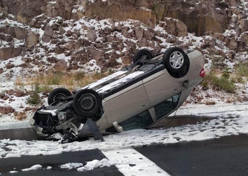 Morelia, Mich.- Un vehículo volcó sobre la autopista Pátzcuaro-Cuitzeo, esto durante una fuerte lluvia con granizo que se registró la tarde de este domingo en dicho lugar.