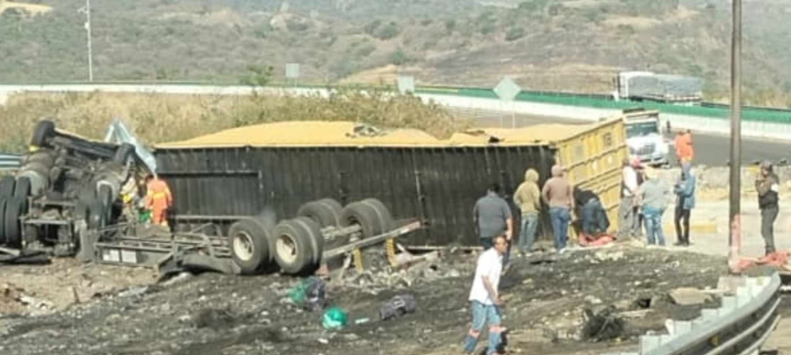 Copándaro de Galeana, Mich.- La mañana de este martes se registró la volcadura de un tráiler en el entronque de las autopistas Pátzcuaro-Cuitzeo/México-Guadalajara, hecho dejó daños materiales.
