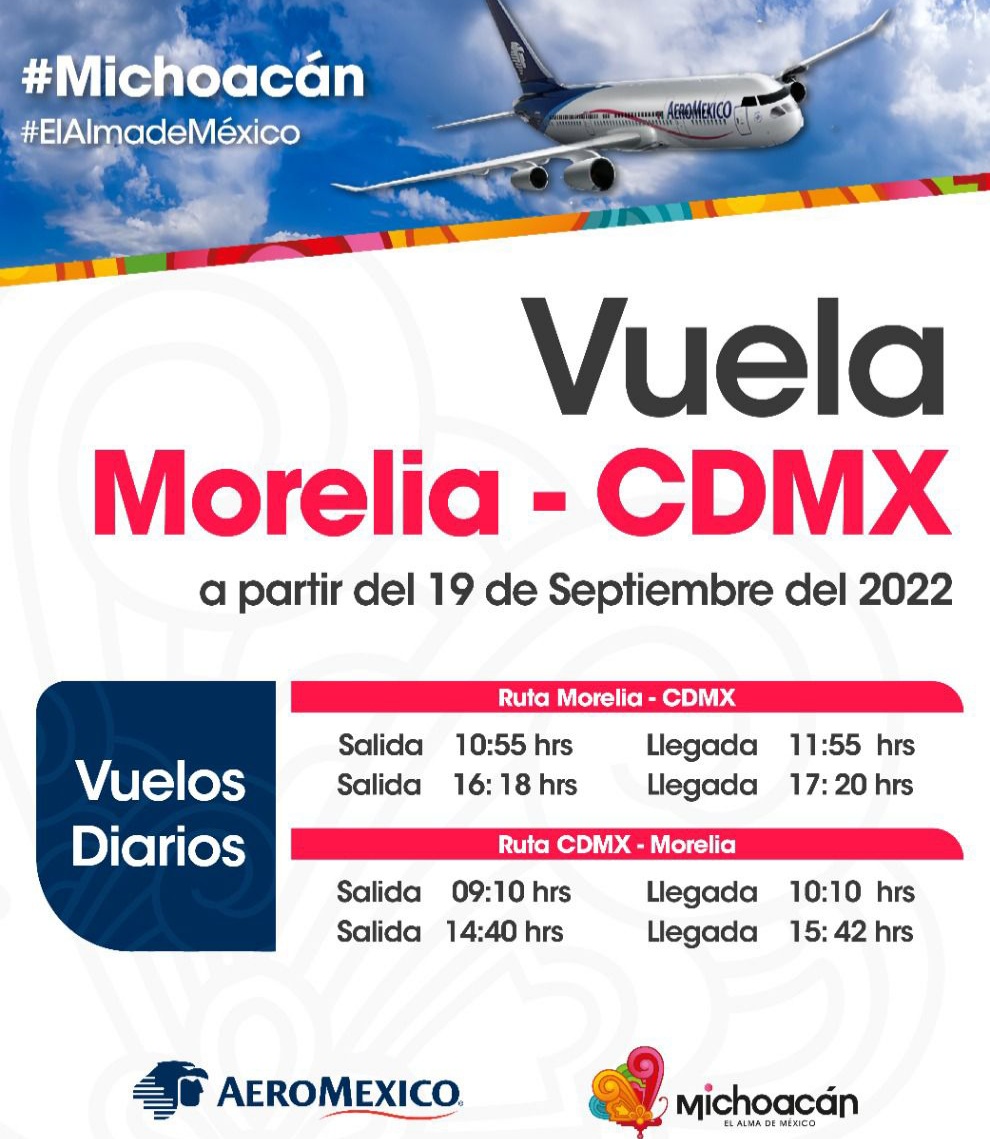 Los vuelos serán de lunes a domingo, con horarios de Ciudad de México- Morelia a las 09:10 horas y 14:40 horas, mientras que de Morelia- Ciudad de México serán a las 10:55 horas y 16:18 horas.
