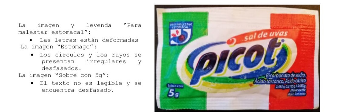 Los productos falsificados muestran en la parte frontal distorsión en la imagen y la leyenda “para malestar estomacal”; además, el texto sobre el gramaje es poco legible. En el reverso, la caducidad no corresponde a la original, el texto es ilegible y la imagen de la mujer embarazada no es nítida, mientras que los bordes son gruesos e irregulares.
