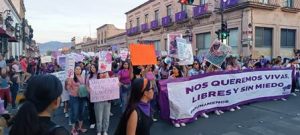 MARCHA: Muy numerosa fue la marcha en Morelia del Día Internacional de la Mujer de este viernes 8 de marzo que abarrotó la Avenida Madero al filo de las 19:00 horas, desde Las Tarascas hasta La Catedral y Palacio de Gobierno, en la que miles de mujeres se pronunciaron en contra “de la desigualdad salarial entre hombres y mujeres, así como de los feminicidios que se vienen incrementando, además de la violación de nuestros derechos humanos”, como lo dejaron plasmado en medio de arengas, cientos de pancartas y pintas de bardas de los edificios históricos de todo ese trayecto, en el que también hubo rompimiento de cristales de ventanas y golpeteo de puertas, esencialmente de los Palacios de Gobierno y del Congreso del Estado…