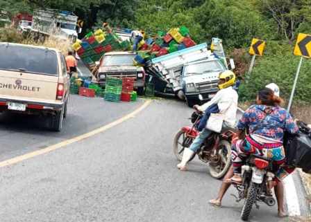 Apatzingán, Mich.- Una camioneta que transportaba cajas con limón sufrió un accidente, cuando la unidad no soportó la carga y venció, cayendo gran parte del fruto sobre otro vehículo limonero.