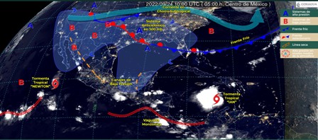 Este día, un canal de baja presión sobre el noroeste, occidente y centro del territorio nacional, en interacción con la humedad proveniente del Océano Pacífico y del Golfo de México, ocasionarán chubascos vespertinos y lluvias fuertes en dichas regiones, además de la Península de Baja California. Los siguientes sistemas: un segundo canal de baja presión sobre el suroeste del Golfo de México y el sureste del país; la vaguada monzónica próxima a las costas del Pacífico Sur Mexicano; el ingreso de humedad del Golfo de México y Mar Caribe e inestabilidad atmosférica superior, provocarán lluvias puntuales intensas en zonas de Oaxaca y Chiapas; puntuales muy fuertes en Guerrero, Puebla, Veracruz y Tabasco; además de chubascos y lluvias fuertes en zonas del oriente, sur y sureste del territorio mexicano, incluida la Península de Yucatán. Durante la noche, se prevé la proximidad de un frente frío, el cual ocasionará vientos fuertes con rachas de 50 a 60 km/h y posibles tolvaneras, además de incrementar el potencial de chubascos y lluvias fuertes con descargas eléctricas sobre Sonora y Baja California. Una circulación anticiclónica en niveles medios de la atmósfera mantendrá bajo potencial de lluvias sobre entidades de la Mesa del Norte y noreste del país. Así mismo, continuará el ambiente vespertino caluroso a muy caluroso con temperaturas superiores a 35°C en zonas del noroeste y noreste de la República Mexicana, además de la Península de Yucatán.
