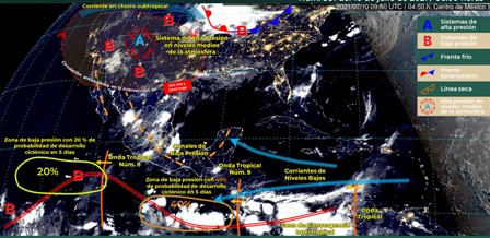 Para el día de hoy, canales de baja presión uno sobre la Península de Baja California, otro que se extiende sobre el norte, centro y sur del país y el último sobre la Península de Yucatán, inestabilidad en niveles altos de la atmósfera y la onda tropical Núm. 9 que afectará el sur de la Península de Yucatán y sureste del país; la interacción de estos sistemas producirán lluvias puntuales intensas en Sinaloa, Durango, Zacatecas y San Luis Potosí; lluvias puntuales muy fuertes en Aguascalientes y Guanajuato. Además existen condiciones para ambiente muy caluroso con temperaturas máximas que podrían superar 45°C en zonas de Baja California y Sonora.