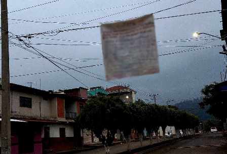 Uruapan, Mich.- En la comunidad indígena de Caltzotzin fue colgada una narcomanta a un costado de la Jefatura de Tenencia cerca de la plaza principal, en el rótulo se anuncia una presunta «limpia» de vendedores de droga, ladrones de aguacate, talamontes y personas que se han apropiado de terrenos ajenos.