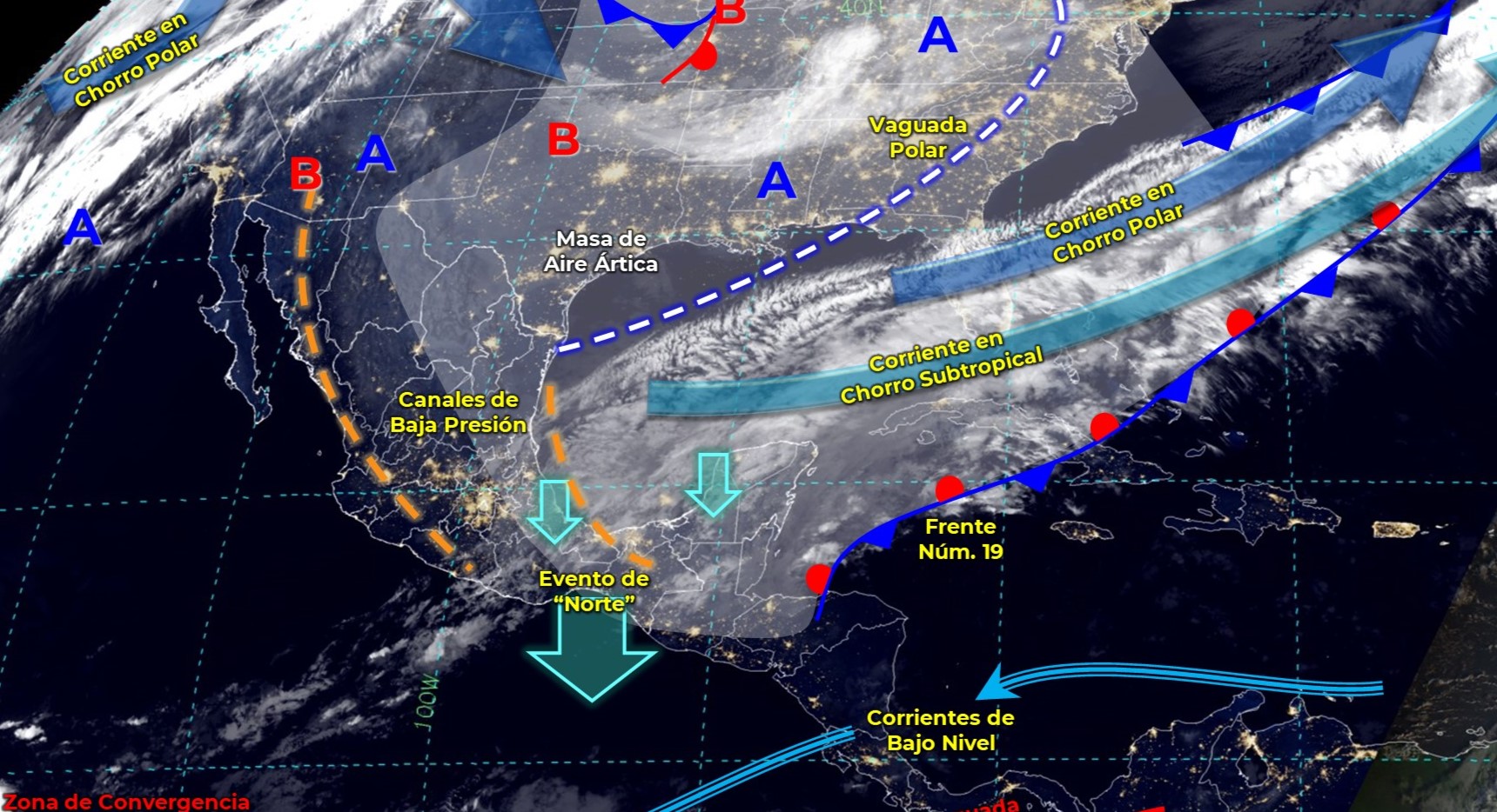 Las condiciones meteorológicas descritas serán ocasionadas por el frente número 19, que se mantendrá estacionario sobre el occidente del Mar Caribe y su masa de aire ártica en interacción con un canal de baja presión sobre el occidente del Golfo de México y el sureste del país.