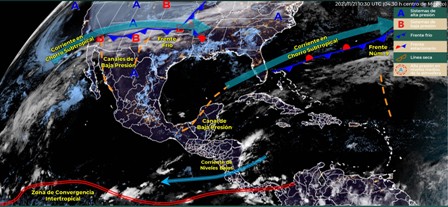 Para el día de hoy, el nuevo frente frío (Núm. 10) ingresará sobre el norte de México, interaccionará con un canal de baja presión sobre esta región, originando lluvias fuertes con tormentas eléctricas y posible caída de granizo en Nuevo León y Tamaulipas, además de vientos fuertes con rachas de 60 a 70 km/h y tolvaneras en estados del norte y noreste del territorio nacional. La masa de aire frío que originó al frente Núm. 9 modificará sus características térmicas, provocando un gradual ascenso de las temperaturas diurnas en el noreste y oriente del país, sin embargo, durante la mañana y noche, prevalecerá el ambiente frío con heladas sobre zonas altas de la Mesa del Norte, Mesa Central y sureste. Asimismo, persistirá el viento de componente norte con rachas de 60 a 70 km/h en el Istmo y Golfo de Tehuantepec. Por otro lado, un canal de baja presión sobre el sureste de la República Mexicana aunado al ingreso de humedad proveniente del Golfo de México, producirán lluvias y chubascos acompañados de descargas eléctricas en dicha región, así como en la Península de Yucatán, con lluvias puntuales fuertes en el sur de Veracruz, Chiapas y Tabasco. En el resto del país, se prevé ambiente cálido durante la tarde y baja probabilidad de lluvia.