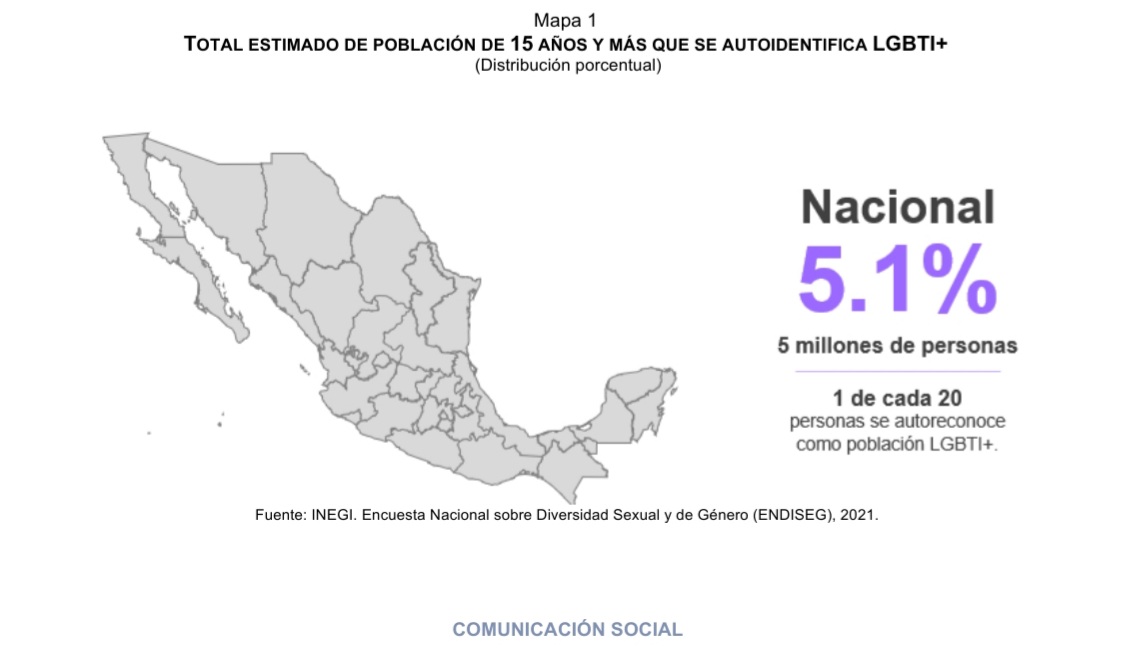 En el marco del Día del Orgullo LGBT y de acuerdo a la Encuesta Nacional sobre Diversidad Sexual y de Género 2021, realizada por el Instituto Nacional de Estadística y Geografía (INEGI), en México, la población LGBTI+ asciende a cinco millones de personas, es decir el 5.1 por ciento de la población de 15 años y más.