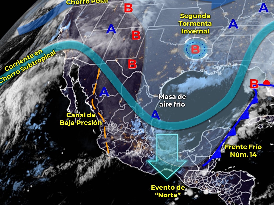 También provocará evento de Norte, con rachas de viento de 70 a 80 kilómetros por hora (km/h) en el Golfo e Istmo de Tehuantepec, ráfagas de 50 a 60 km/h en costas de Campeche, Quintana Roo, Tabasco, Veracruz y Yucatán, y oleaje de 1 a 3 metros (m) de altura en el litoral de Campeche, Tabasco, Veracruz y Yucatán, así como en el Golfo de Tehuantepec.