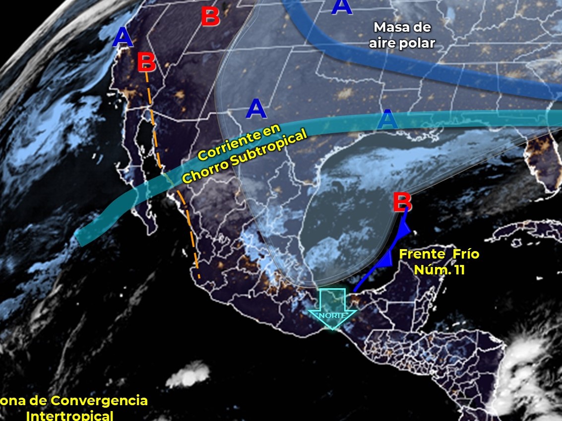 Hoy, el Frente Frío Número 11 recorrerá la Península de Yucatán y el sureste de la República Mexicana. A su paso, ocasionará lluvias puntuales intensas (de 75 a 150 milímetros [mm]) en el oriente de Oaxaca, el occidente de Tabasco y el sur de Veracruz; muy fuertes (de 50 a 75 mm) en regiones de Chiapas, y fuertes (de 25 a 50 mm) en zonas de Campeche y Puebla.