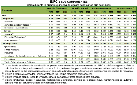 En la primera quincena de agosto de 2022, el Índice Nacional de Precios al Consumidor (INPC) aumentó 0.42 % respecto a la quincena anterior. Con este resultado, la inflación general anual se ubicó en 8.62 por ciento. En la misma quincena de 2021, la inflación quincenal fue de 0.02 % y la anual, de 5.58 por ciento.