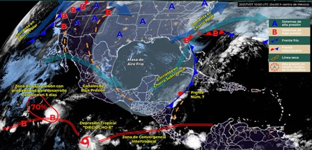 Para hoy, la masa de aire frío asociada al frente núm. 7, mantendrá temperaturas frías a muy frías durante la mañana y noche con posibles heladas matutinas sobre entidades del norte, oriente y centro del país, además de viento de componente norte con rachas de 60 a 70 km/h en el Istmo de Tehuantepec y con oleaje de 1 a 3 metros en el Golfo de Tehuantepec. Por otro lado, canales de baja presión en interacción con el ingreso de humedad del Océano Pacífico y Golfo de México, ocasionarán lluvias aisladas en el noreste e intervalos de chubascos sobre el oriente y sureste del territorio mexicano, con valores puntuales fuertes en Puebla, Veracruz y Oaxaca. Finalmente, la Depresión Tropical “Dieciocho-E” mantendrá su desplazamiento hacia el oeste, sin afectar costas mexicanas.