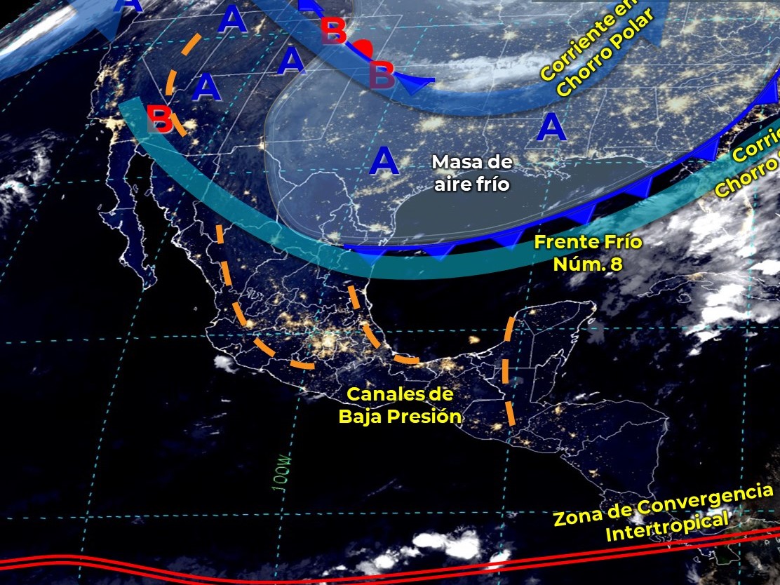 Estas condiciones serán generadas por el Frente Frío 8, canales de baja presión extendidos sobre la Península de Yucatán, el oriente, sur y sureste de la República Mexicana