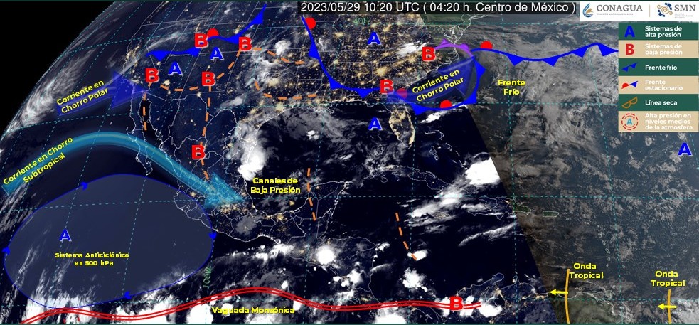 Este día, una línea seca se localizará sobre el norte de México, interaccionará con un canal de baja presión que se extenderá sobre la Mesa del Norte y la Mesa Central y con el ingreso de humedad del Océano Pacífico y Golfo de México; y un segundo canal de baja presión sobre la Península de Yucatán, originarán lluvias muy fuertes en Nuevo León, Tamaulipas y Chiapas, lluvias fuertes en San Luis Potosí, Hidalgo, Ciudad de México, Estado de México, Morelos, Tlaxcala, Puebla, Veracruz, Oaxaca y Yucatán, además de lluvias aisladas con chubascos en entidades del norte, occidente, sur y sureste de México, incluidas zonas de la Península de Yucatán. También, continuará el ambiente caluroso a muy caluroso sobre entidades del litoral del Pacífico Mexicano, el oriente y sureste del territorio nacional, así como en la Península de Yucatán, con temperaturas superiores a 40 °C en zonas de Jalisco, Michoacán, Guerrero, Oaxaca, Chiapas, Veracruz, Tabasco, Campeche, Yucatán y Quintana Roo.