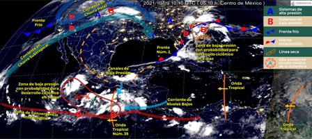 Este día, la zona de baja presión con alto potencial ciclónico asociada con la onda tropical Núm. 35, al sur de las costas de Oaxaca y Guerrero, reforzará el aporte de humedad y ocasionarán lluvias fuertes a muy fuertes en zonas del sur, sureste y oriente del territorio nacional. Canales de baja presión sobre el occidente y oriente de México, originarán chubascos y descargas eléctricas en dichas regiones, incluida la Península de Yucatán. Un nuevo frente frío se aproximará a la frontera noroeste del país y en interacción con la corriente en chorro subtropical, producirán rachas de viento de 60 a 70 km/h y posibles tolvaneras en Baja California, Sonora y Chihuahua. Finalmente, prevalecerá ambiente caluroso sobre zonas de Baja California Sur, Sonora (sur) y Sinaloa, así como en la Península de Yucatán.