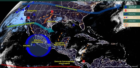 Península de Baja California: Cielo despejado y sin lluvia en la región. Bancos de niebla al amanecer en la costa occidental de la Península. Temperaturas frías con heladas al amanecer en zonas serranas de Baja California. Ambiente cálido por la tarde en Baja California Sur. Viento del noroeste de 15 a 30 km/h.