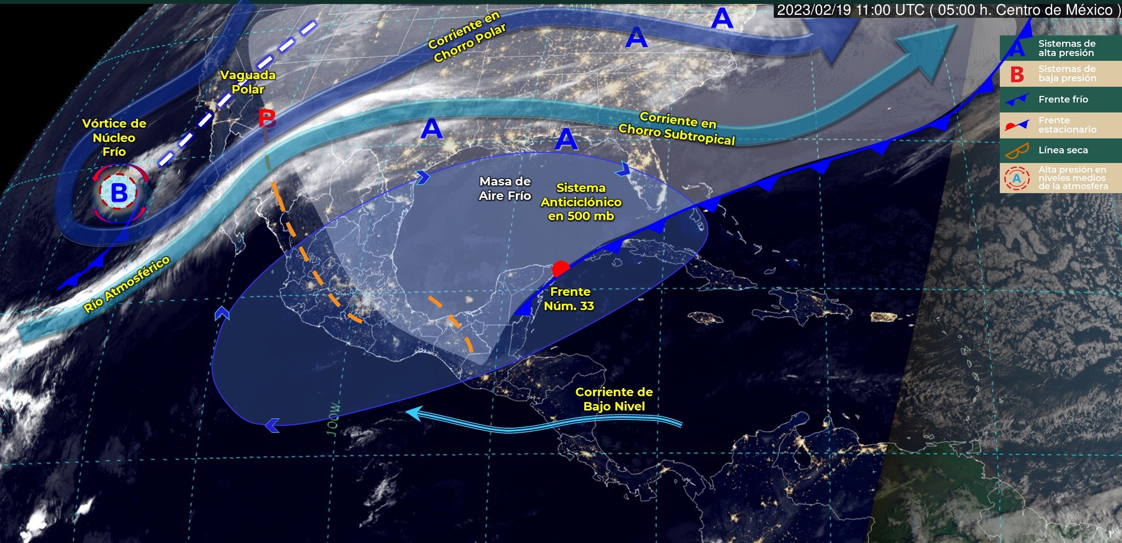 El frente Núm. 33 comenzará a dejar de afectar al país durante la mañana, mientras que un canal de baja presión sobre el suroeste del Golfo de México, originará lluvias fuertes en el sur de Veracruz y Tabasco, así como chubascos en Oaxaca, Chiapas y Campeche. La masa de aire frío que impulsó al frente frío modificará gradualmente sus características térmicas en el transcurso del día, sin embargo, se mantendrá el viento de componente norte con rachas de 60 a 80 km/h en el Istmo de Tehuantepec, con olas de 2 a 4 metros en el Golfo de Tehuantepec. Por otra parte, el abundante ingreso de humedad generado por el río atmosférico y la aproximación de un nuevo frente frío asociado con un vórtice de núcleo frío a la Península de Baja California, generarán lluvias y vientos fuertes en Baja California, Sonora y Chihuahua, chubascos en Baja California Sur, así como caída de nieve, aguanieve o lluvia engelante en las sierras de Baja California, Sonora y Chihuahua. Finalmente, un sistema anticiclónico en niveles medios de la atmósfera ocasionará ambiente vespertino cálido a caluroso y sin lluvias en el occidente y centro del territorio nacional, incluido el Valle de México.
