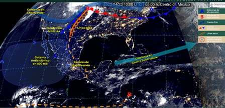 Durante este día, el frente frío Núm. 44 y una línea seca sobre el norte y noreste de México, originarán lluvias fuertes con descargas eléctricas y posibilidad para la caída de granizo en Coahuila, Nuevo León, Tamaulipas y San Luis Potosí, además existe la probabilidad de formación de torbellinos o tornados en Coahuila, Nuevo León y Tamaulipas. También se presentarán rachas de viento de 60 a 70 km/h con tolvaneras en los estados de la Mesa del Norte.
