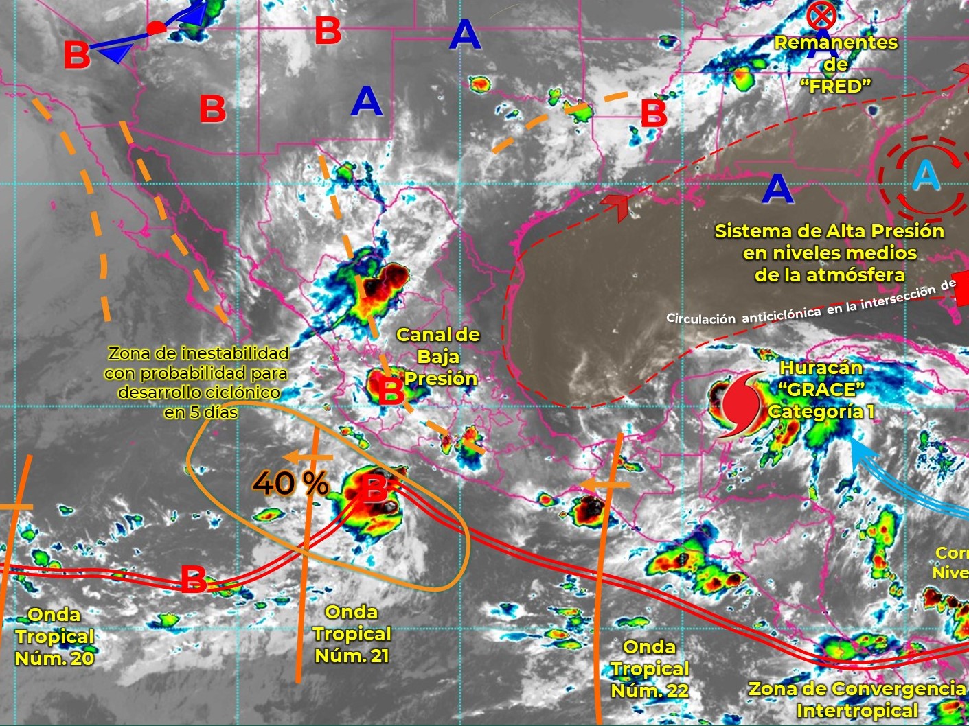En el transcurso de este jueves, Grace se degradará a tormenta tropical mientras se desplaza sobre Yucatán, y para la noche de hoy, se adentrará en el Golfo de México donde volverá a intensificarse a huracán de categoría 1, fuerza con la que impactará nuevamente el territorio mexicano, esta vez en las costas de Veracruz.